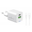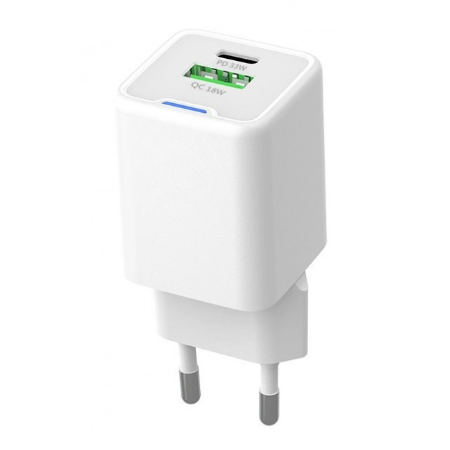 Υψηλής απόδοσης φορτιστής τοίχου της Powertech, κατασκευασμένος από ανθεκτικό υλικό και συμβατός με συσκευές που φορτίζουν μέσω θύρας USB. Διαθέτει USB και USB-C θύρες εξόδου που υποστηρίζουν φόρτιση με μέγιστη συνολική απόδοση 33W.