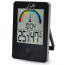 Ψηφιακό θερμόμετρο / υγρόμετρο εσωτερικού χώρου με ρολόι και έγχρωμη απεικόνιση επιπέδου υγρασίας, σε μαύρο χρώμα.