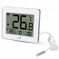 Ψηφιακό θερμόμετρο εσωτερικής και εξωτερικής θερμοκρασίας, με ενσύρματο εξωτερικό αισθητήρα και ένδειξη ώρας, σε λευκό χρώμα.